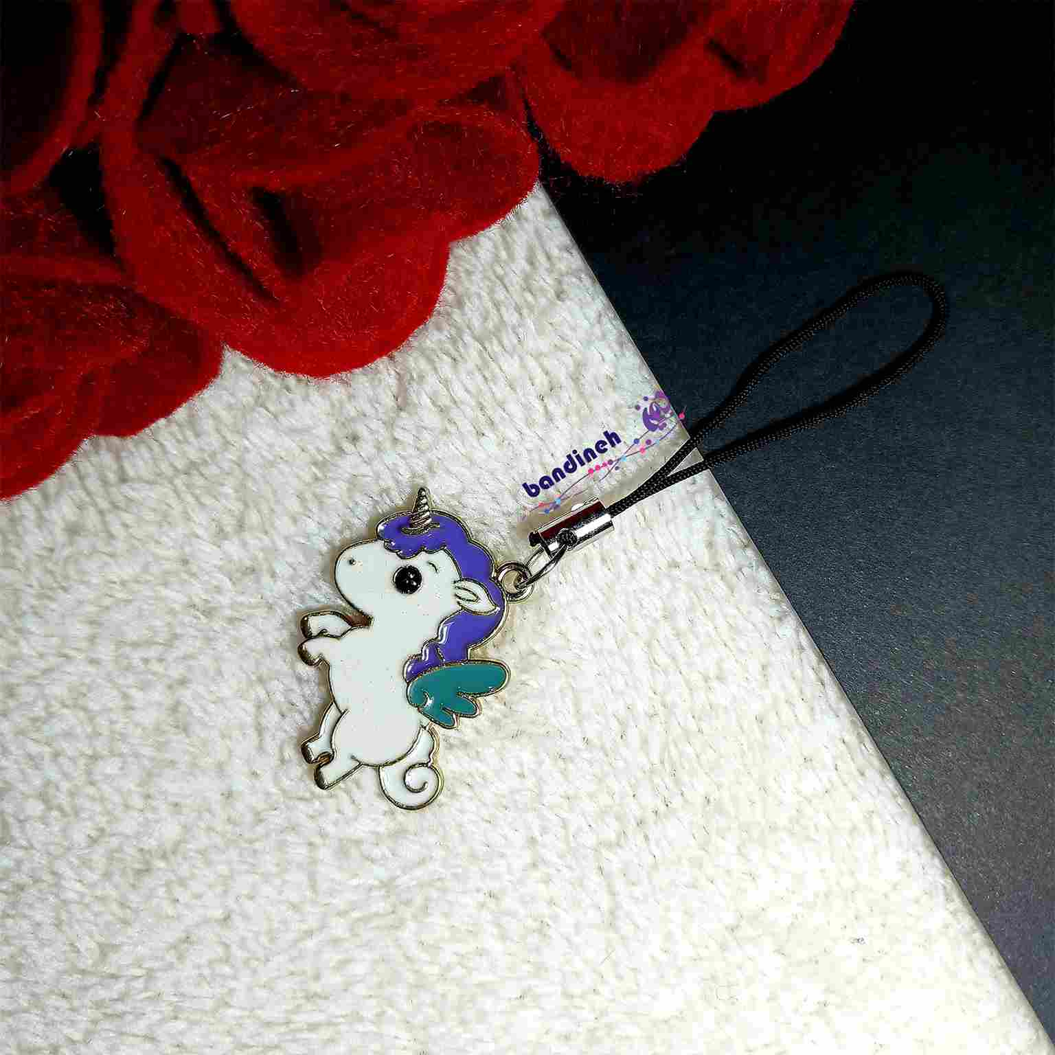 آویز گوشی مدل یونیکورن با جنس استیل سبک و طراحی فانتزی، مناسب برای استفاده به‌عنوان آویز موبایل، فلش، جاکلیدی و کیف.