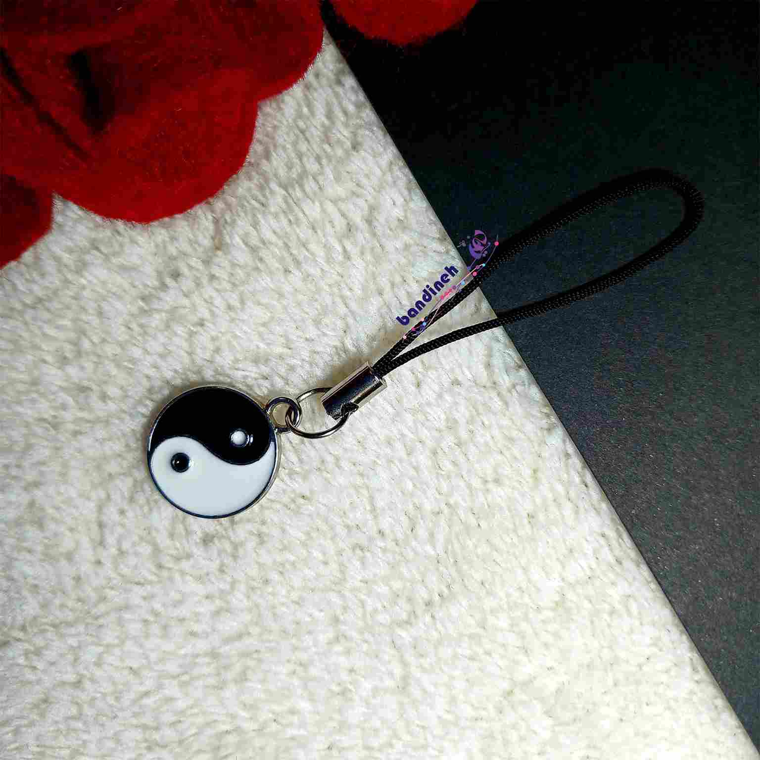 آویز گوشی مدل یین و یانگ با جنس استیل سبک و طراحی خاص، مناسب برای استفاده بهعنوان آویز موبایل، فلش، جاکلیدی و کیف.