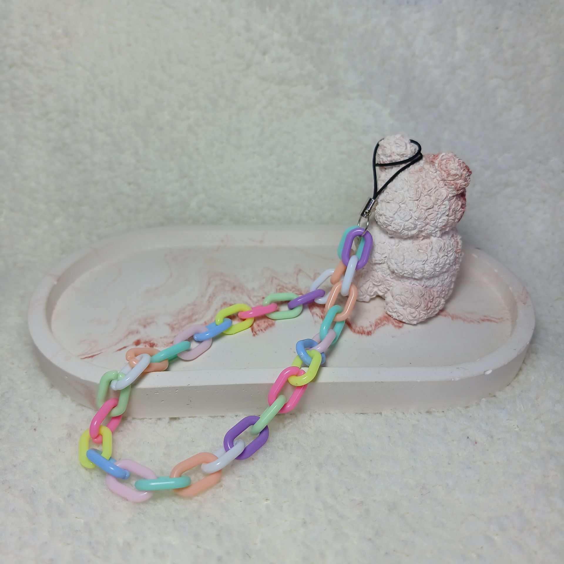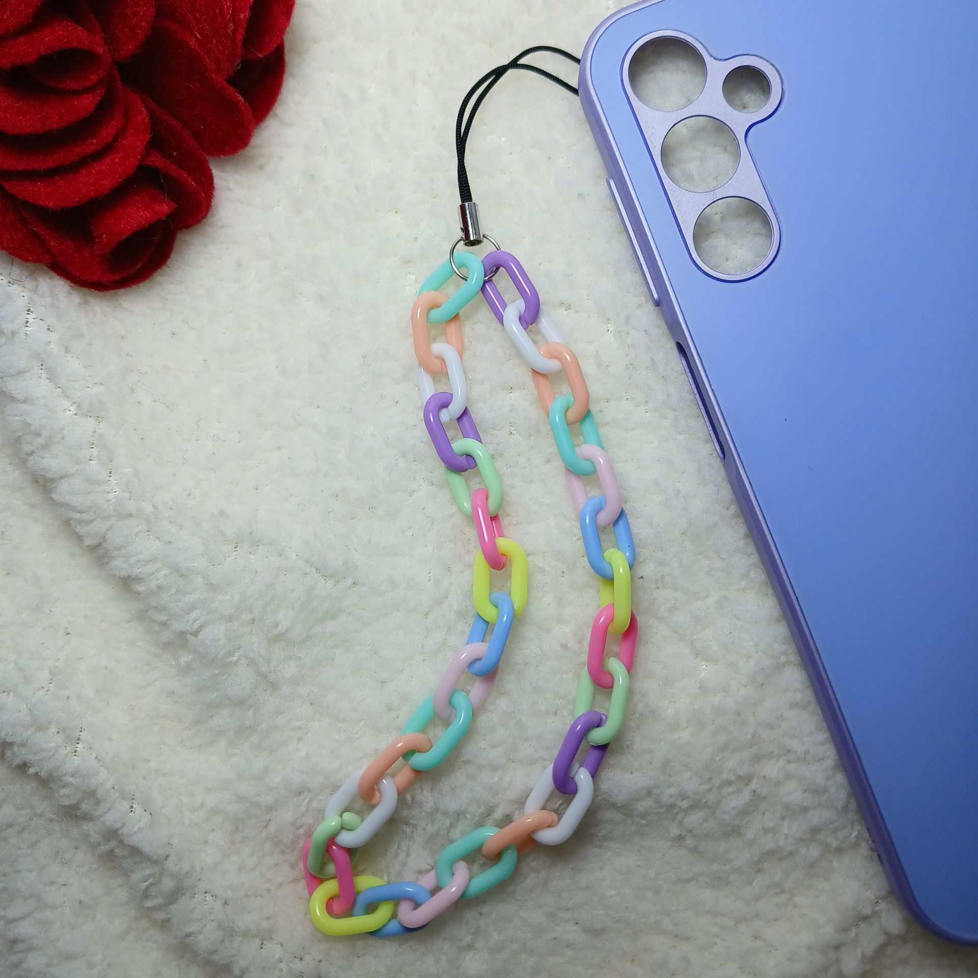 در دل دنیای رنگارنگ اکسسوری‌ های مدرن، بند گوشی مدل زنجیرک با طراحی خلاقانه و پیوند های زنجیره‌ ای پاستلی شما را به سفری فانتزی و شاد دعوت می‌ کند. هر حلقه‌ ی این بند گوشی از ترکیبی از رنگ‌ های نرم و دلنشین صورتی، آبی، سبز و زرد پاستلی تشکیل شده و به لطف جنس بند گوشی زنجیری مانند و انعطاف‌ پذیر، حس خوشایندی را در دست منتقل می‌ کند. اتصال ساده اما امن آن با یک حلقه مقاوم باعث می‌ شود بند قاب گوشی شما محکم بنشیند و از افتادن ناخواسته گوشی جلوگیری کند. اگر به دنبال یک بند گوشی فانتزی متفاوت و خاص هستید که هم نقش نگهدارنده داشته باشد و هم به‌ عنوان یک اکسسوری فانتزی و جذاب بدرخشد، بند گوشی زنجیرک با رنگ‌ های ملایم و استایلی دخترانه و دوست‌ داشتنی بهترین انتخاب شماست!